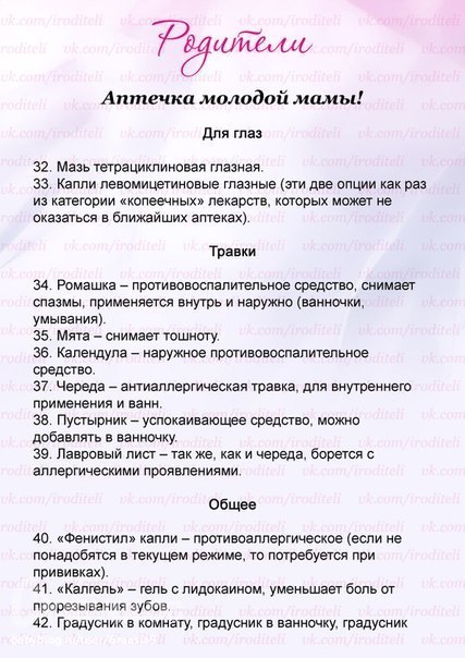 Большинство из вышеперечисленного у нас в аптечке уже давно есть по причине большого количества детей))).Никогда не пользовалась только Фурацилином,никакими видами клизм,свечками глицериновыми.Аспиратор у нас Отривин бэби,очень удобный.Отлично отсасываются сопли,хорошо моется.Сменные насадки 3 в комплекте,а потом можно докупить.Калгель был абсолютно бесполезен при прорезывании,больше всего в ход шли мамины руки))).А вот хлорофиллипт (масляный) мы использовали для горлышка-мазали при простуде и ОРВИ,отлично лечит и смягчает горлышко,наносится на пустышку и в рот малышу,абсолютно натуральный.Купаем мы детей без марганцовки и жидкого мыла (с мылом уже после месяца раз в 7-10 дней),травки только добавляем.Когда пупок зажил,она не нужна,а до того он (ребёнок) ещё не успевает слишком загрязниться))),умываемся только и складочки промываем кипячёной водичкой.Попа само собой моется с мылом под проточной водой после каждого каканья.А пупочек лучше обрабатывать не зелёнкой (под ней можно проглядеть воспаление и покраснение),а перекисью водорода и затем настойку календулы или хлорофиллипта капаем в пупочек.Но зелёнку надо всё равно иметь,для залечивания будущих ран (особенно тем,у кого мальчики),она отлично кровь останавливает из губ,рта,бровей и век,когда любопытное чадо сверзнется с очередного стула или стола.И конечно про пустырник для мамы-это не шутка!У меня правда Персен лежит для этих целей.Очень нужная вещь.