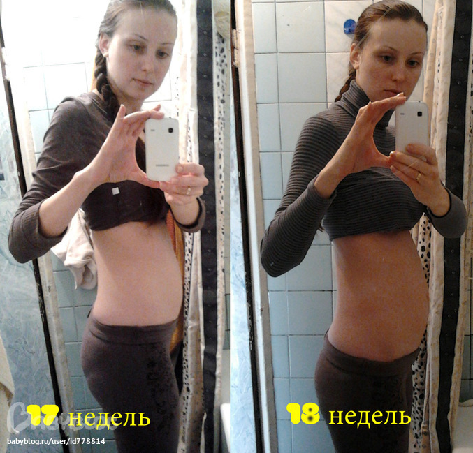 Фото пузиковВот и стукнуло 18 недель, вес не изменился за неделю, так и остался 57.1 что не может не радовать :) Сегодня ездила сдавать "тройной гормон". В очереди было куча беременяшек с красивыми большими пузами, я среди них смотрелась, как объевшийся котенок))))) фото прилагается)