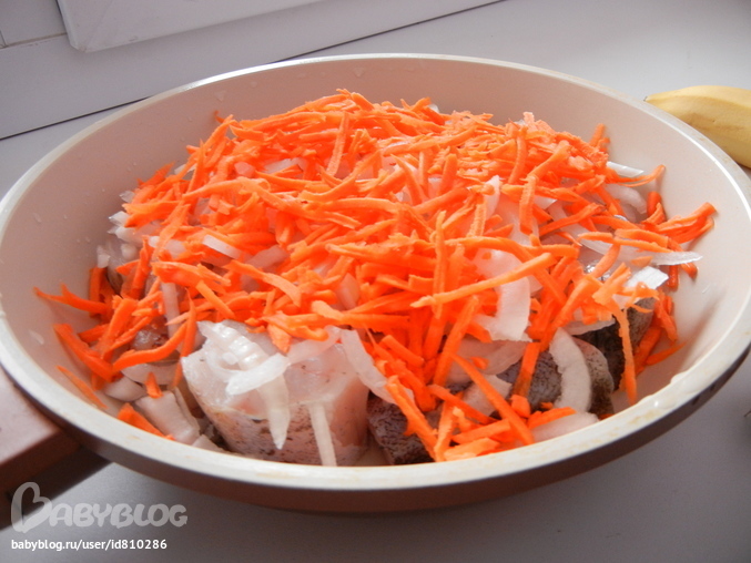 рыбку чистим, режем на кусочки, укладываем в сковороду , сверху лук, морковь, солим, перчим по вкусу, накрываем крышкой и на огонь.