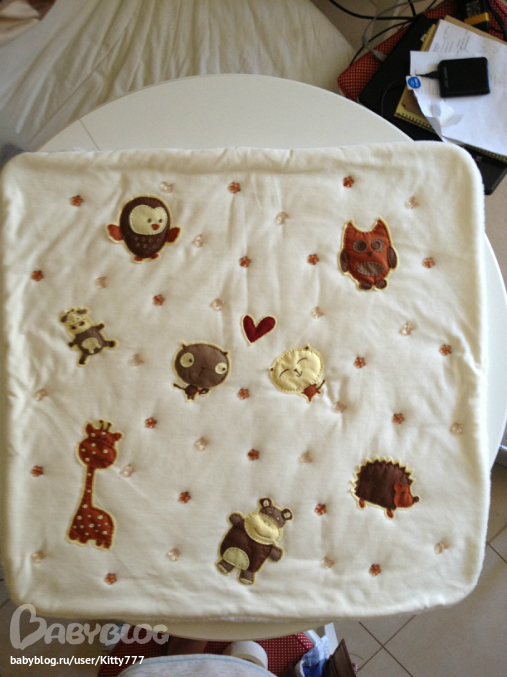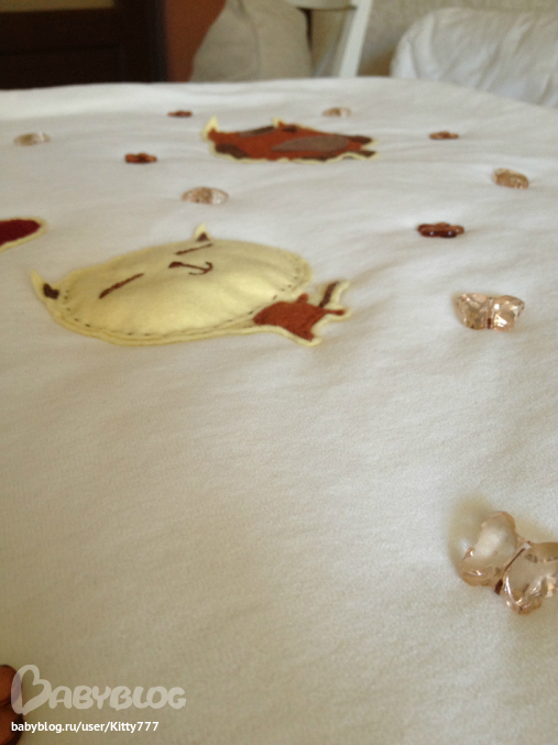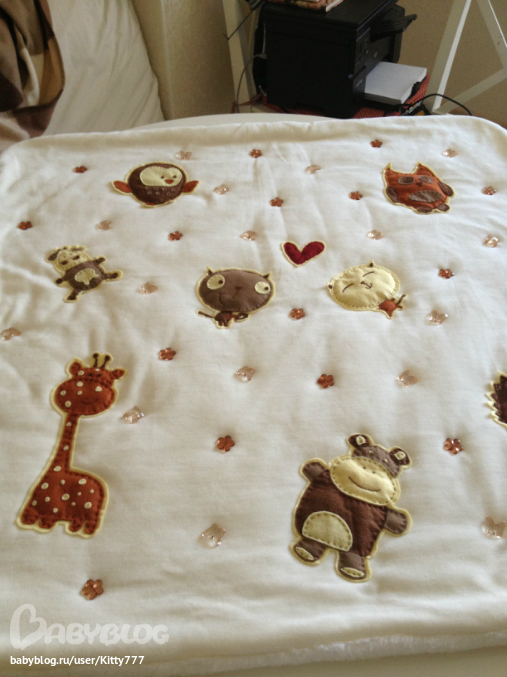 Каждый вечер гладим с папой пузо, уговариваем. Но пока даже треников нет. Только спать совсем тяжело стало - перевернуться с бока на бок - целая история... Для того чтоб на ожидании не заморачиваться драю дом и занялась рукоделием. Про последнее поподробнее: у нас было одеялко-плед на выписку светло-бежевого цвета. С одной стороны там велюр, с другой - овчинка. Так я задалась целью его украсить вручную. Наделала фигурки животных из декоративного фетра и расшила все бусинами. Так что выписываться мы будем по королевски. Фото прилагаю
