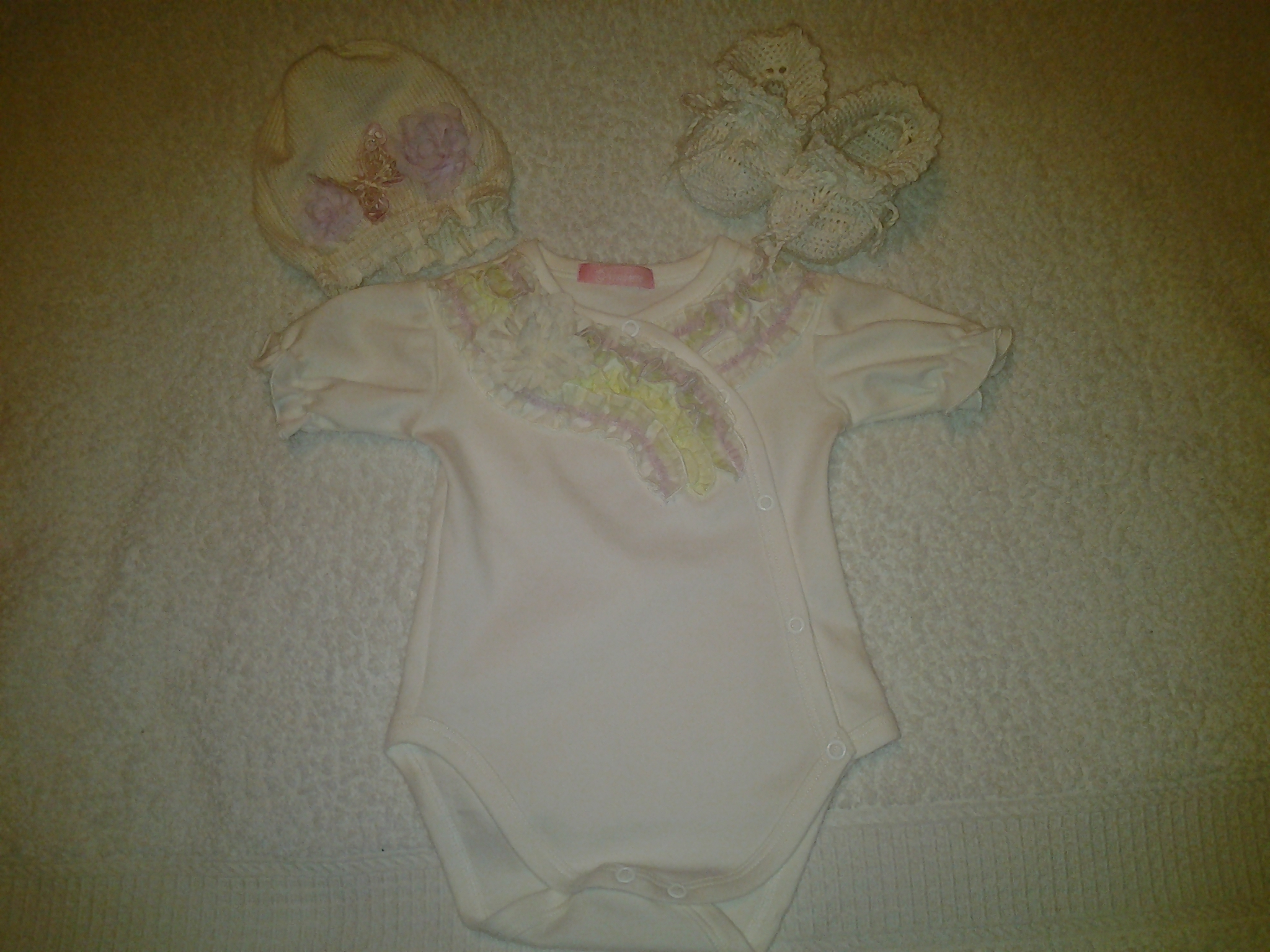 боди и ползунки 56, пр-во Украина и ниже боди и шапочка 62, Шопет, а пинетки не знаю кто вязал))