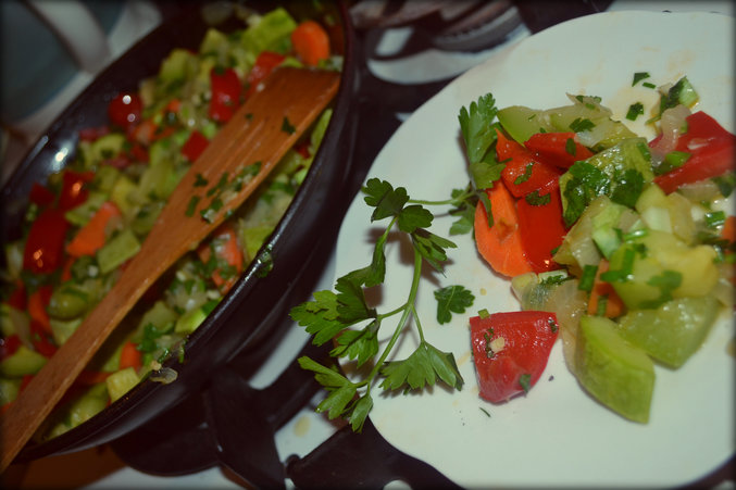 Мой культ – рагу! Кума, правда, сказала ,что это не рагу, а чёрти что, но тушеные овощи в собственном соку душить мясом и жиром не люблю. Печёнка и так у меня уже в печёнке сидит, готовлю их раздельно друг от друга.