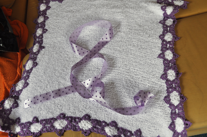Ну и никакого конверта мы не покупали, мамуля связала великолепный плед и лента у нас стиляжная :))) В горошек.
