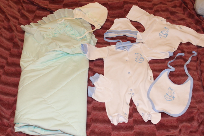 А ещё купили комплект на выписку, главное, что конверт, который без рюш!!!единственный такой нашла.