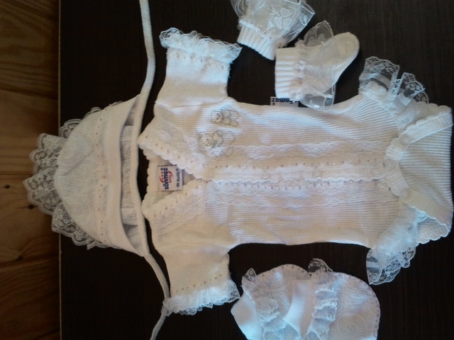 Одежда, игрушки, техникаДолго искала по магазинам что-то нарядное или хотя бы маленькое и светлое.Ничего!все симпатичное 62р,да и 56 таким огромным кажется,не хочется,чтобы доча в мешке бултыхалась. Поэтому я купила малюсенький чисто белый бодик,чепчик и носочки ну и вот что сделала со всем этим добром!таким образом потратила на вещи+фурнитуру максимум 10баксов и один вечер))))