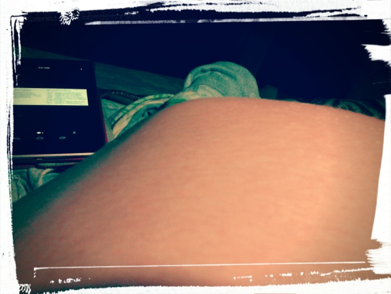 Так она засранка пока я фокусируюсь показывает ее, а как только начинаю фоткать прячет. Пока сижу с наведенным фокусом вообще не выпирает ножку. Стоит положить фотик сразу опять выставляет:-) Но один раз я частично успела словить ее культявку:-) На фото левая часть моего пузика:-)
