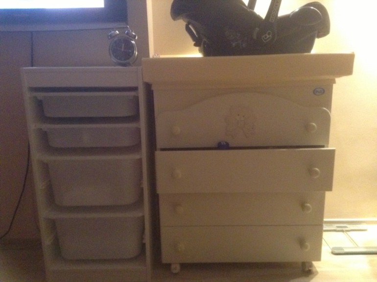 Наши будни, наши неделькиДевочки, помогите мне плиз придумать вот что: куда девать детскую косметику, салфетки, памперсы, тряпочки-пеленки, одноразовые пеленки и тд. Ну то есть то, что всегда должно быть под рукой, когда я занимаюсь ребенком? Смотрите, у меня есть комод, где лежат детские шмоточки, на этом комоде стоит пеленальная доска. Вот в принципе и все место. Я думала над каким-нибудь таким передвижным ящиком-контейнером, чем-то средним между тумбочкой, ящиклм и комодом. Но не знаю, будет ли это удобно или наоборот это глупость и он будет мешаться под ногами повсюду? Как думаете? Где у вас лежит все это?