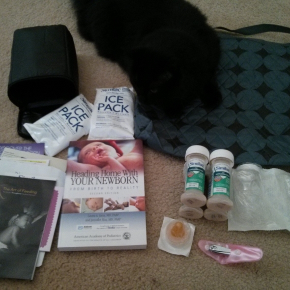 В большом пакете оказалась сумка а-ля для памперсов, пробники смеси для кормления, сумка-термос с двумя бутылочками и соской для грудного молока, кусачки для ногтей, чудо книжка по уходу за новорожденным ( как раз подтяну свой английский) и целая стопка купонов и сетрификатов, и еще какие-то журналы. Люблю подарки!