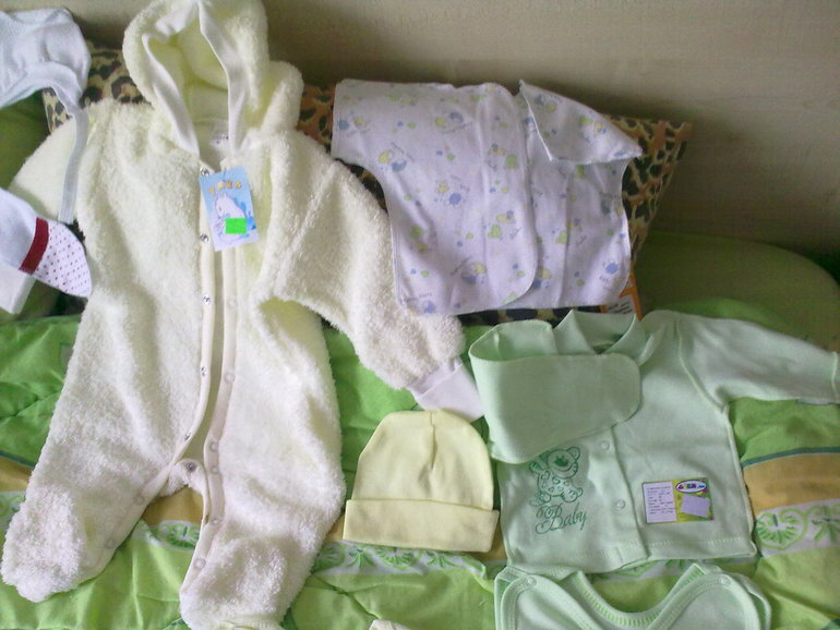 Пушистый комбезик и белый в красный горошек костюм-на выписку. Осталось комбез-трансформер докупить и теплую шапочку. Ну и кучи габарита и мелочей+сумки в роддом...