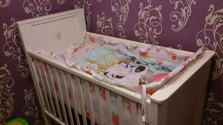 Кроватка, матрасик, комплект в кроватку, а еще купили специальную подушку чтобы ребенок был не много под наклоном, бортики не привязывала нацепила сфоткала и убрала обратно, балдахин без мужа вообще не смогла поставить, будет муж когда я в роддоме проходить их отпаривателем и балдахин цеплять сам . Кроватку изначально хотела подешевле, но зашла в детский мир увидела и влюбилась