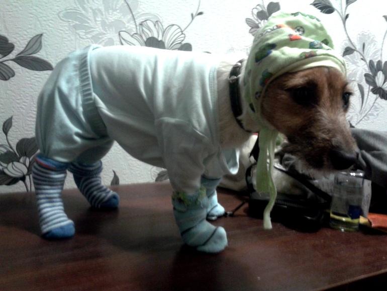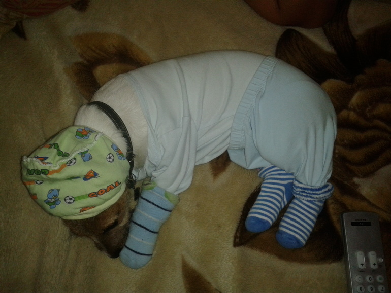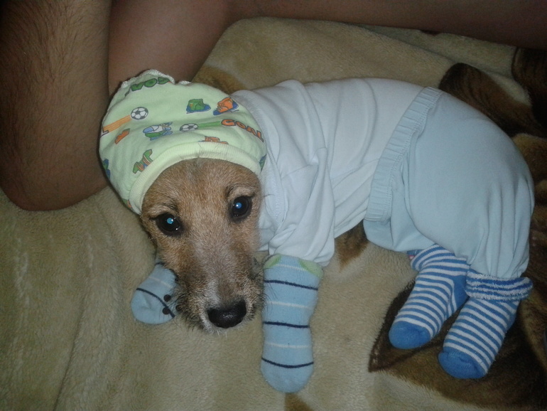 Надеюсь что эту одежду после собаки вы потом выбросите) У нас дома кошка живет, но к детскому мы ее на метр не подпускаем
