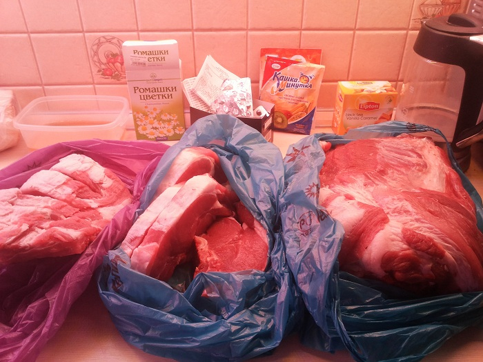 Вчера послала за мясом, все написала (говядины 2 кг. и свинины антрекот и шеи 3 кг.) притащил ооооо 7кг свинины)))) люблю его до безумия, добытчик))) только куда его девать, морозилка почти под завязку)))