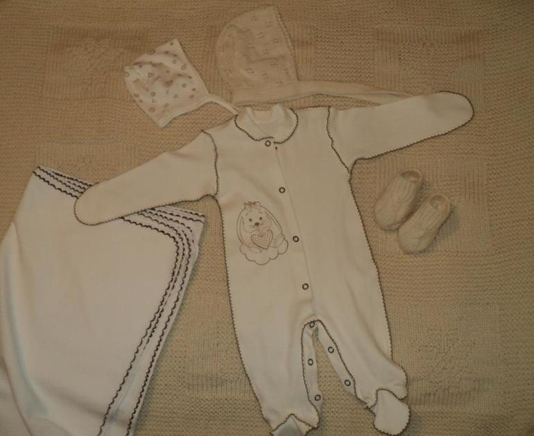 Вот что получилось: купила красивый слипик с полностью зашитыми ручками, пеленочку фланелевую (декоративную отстрочку делали с подругой - чтобы в тему к слипику был))), тоненький чепчик, шерстяную шапочку и пинетки связала сама. Ну и завернем мы наше чудо в вязаный мною плед, и теплый конверт на овчине. Конверт выбирался универсальный, для дальнейших прогулок.