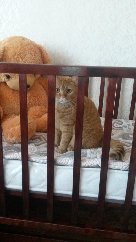 Сидит, деловой, в пустой кроватке) Но я его выгоняю, нечего посягать на чужое добро)))