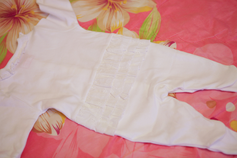 Беленький. Этот тоже с рюшами на попе))) Защипы не глубокие, так что пупсику давить не будут, я думаю. И впереди на крудке шитьё. Таой милый))
