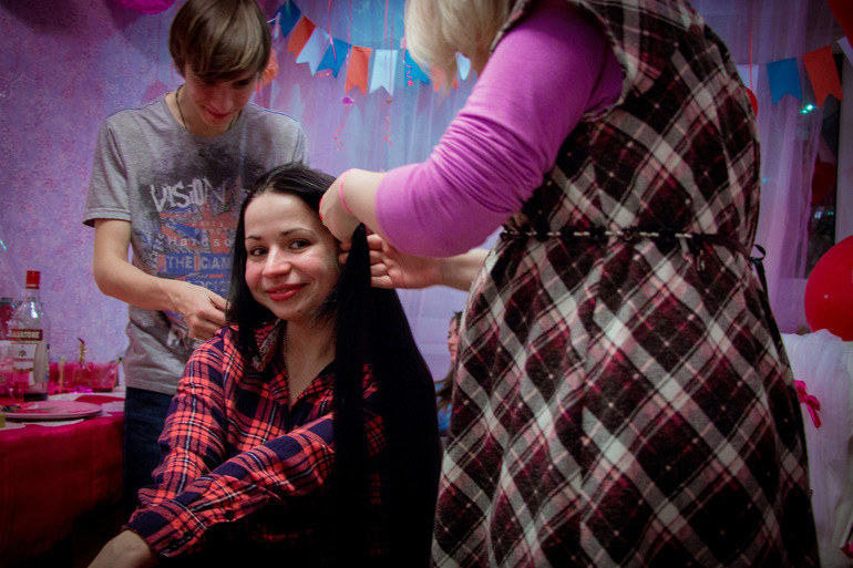 далее следовало задание еще похлеще чем пеленание - заплести косы))) огромное спасибо Любе что предоставила свои шикарные волосы на растерзание))) ну с косами я еще справилась, но вот на дуле провалилась) зато мужик всех повеселил когда завязывал ленточку)
