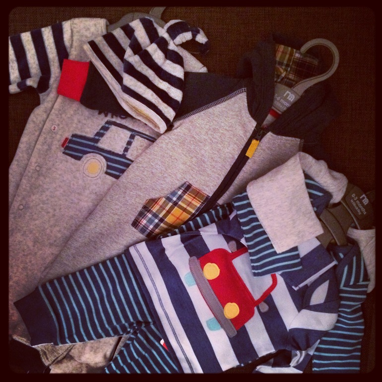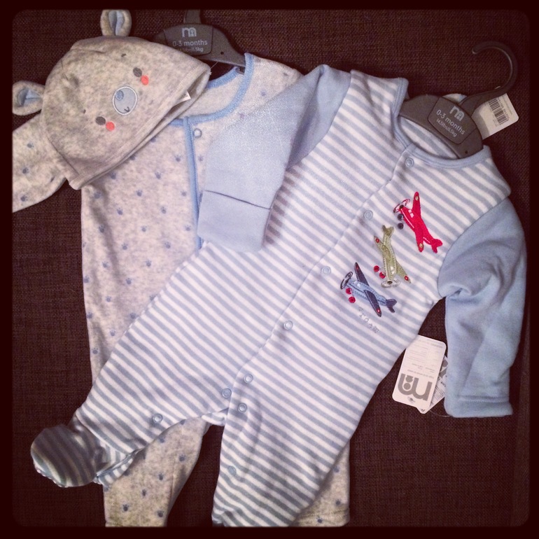 Три кофточки, двое штанишек, два велюровых комбеза с шапочками, два утеплённых, двое пинеток-тапочек (не знаю зачем, мама в них вцепилась) и пустышка bibi с надписью (не знаю понадобится ли, но не купить не смогла).