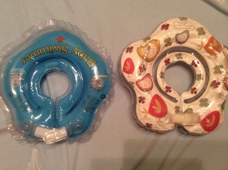 3. Круг на шею Happy Baby с 3 месяцев, и круг на шею Baby swimmer. Сначала мы плавали пару раз в круге хиппи бэби, но ребенок выскользнул и купили с отверстием поменьше. 2 круг максимум до 5 месяцев, потом сильно давит на шею.