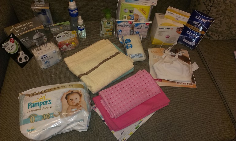 Ну и еще всякие мелочи, буду сейчас раскладывать в пакеты. Лиф для кормления, прокладки для груди, крем для сосков, бепантен, одноразовые трусики и пеленки, ночные прокладки (самые большие), пеленки хб, полотенца, подгузники (есть и для меня взрослые :)), ну и левый верхний уголок на фото остается дома и будет ждать Дочу. Еще в роддом поедут мои косметические принадлежности, медикаменты (зеленка, перекись, ватные палочки), кружка-ложка-вилка, влажные салфетки для меня и для ляльки...