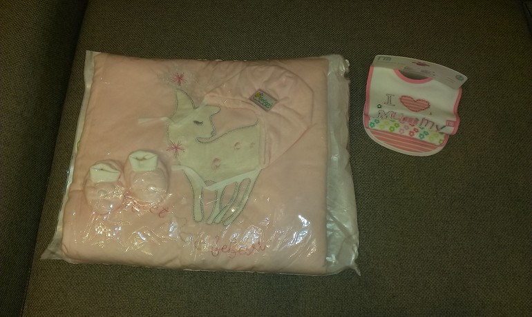 Мама еще купила нам такой наборчик на выписку - очень нежное мягкое конверт-одеялко+шапочка+топики с помпончиками. И вот такие слюнявчики :)
