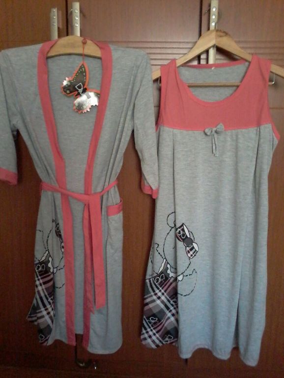 Теперь в роддом. Опять мама, что бы я без нее делала, купила мне вот такой комплект - халатик и сорочку для кормления. Маленькое дополнение - в строчке под складками огромные прорези для груди, ткань легко отодвигается в сторонку и сися готова :)