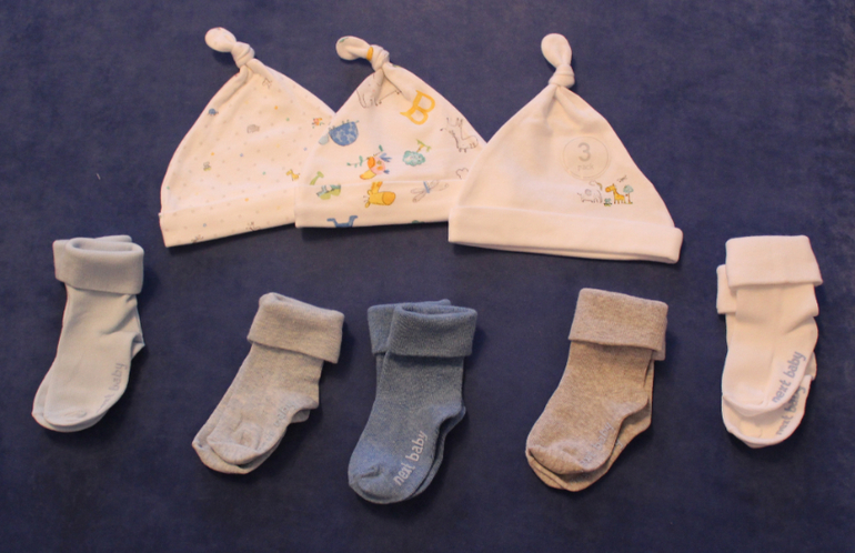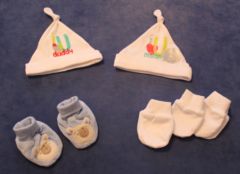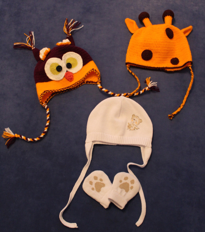 Вязанные шапочки (на заказ, сама не умею) и шапочка с медвежонком и царапки (на выписку, Mothercare).