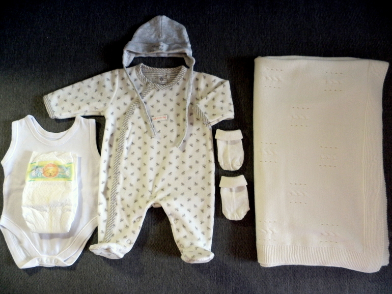 Подгуз + Боди-маечка + Носочки + Велюровый слип + Трикотажная шапочка + Вязаный пледик