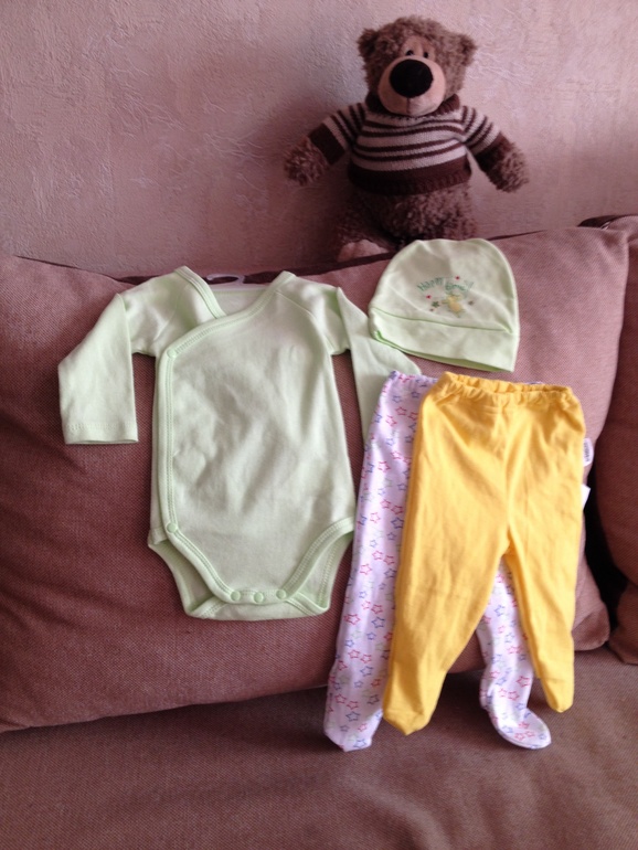 Боди с длинным рукавом на клепках (как по мне так это оооочень удобно) и такого же цвета шапочка (цвет нежно салатовый); штанишки (ползунки) чтобы с боди одевать, скорее всего их дома будем носить!)))