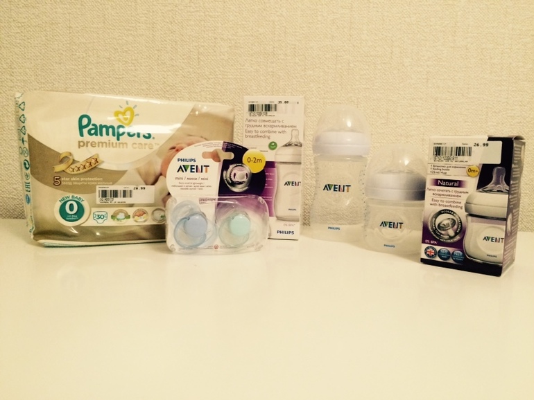 Еще купили две авентовские бутылочки, две пустышки и самые маленькие памперсы, их очень тяжело почему-то найти в наших магазинах