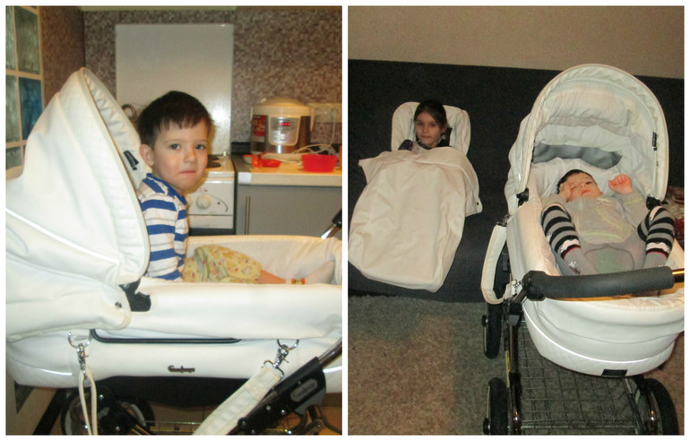 Так вам еще одна нужна коляска, эта занята уже!!!! Фотки клевые! Я бы побоялась положить такого бойца в люльку, значит хорошая коляска, крепкая! Дети вспомнили детство)))))