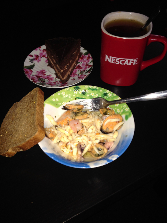позвонила мужу попросила кинуть денег на карту, у меня закончились хотела сбегать в магаз, ну в общем вот что я съела типа на обед...торт с чаем, морские "гады" в масле и кусок хлеба....это было час назад....