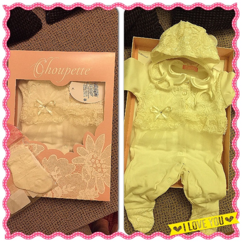 Вы как всегда очаровательный - костюмчик прелестный: у нас тоже есть комплект Choupette - "Восточный Экспресс", нам его подарили. На выписку одеть его не сможем (там размер на трехмесячного ребёнка), поэтому выгуляем его только на крестинах:) На выписку я припасла красивый бодик с юбочкой, лёгкую шапочку а-ля гном и красивые пинеточки. Наверх - конверт-кокон (его пока ещё не купила). На случай прохладной погоды или дождя на смену бодику есть нарядный слипик в зайчатах:)