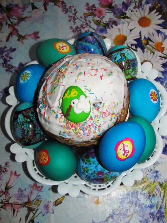 Несмотря на плохое самочувствие, яички я покрасила.кулич купила. Вот: