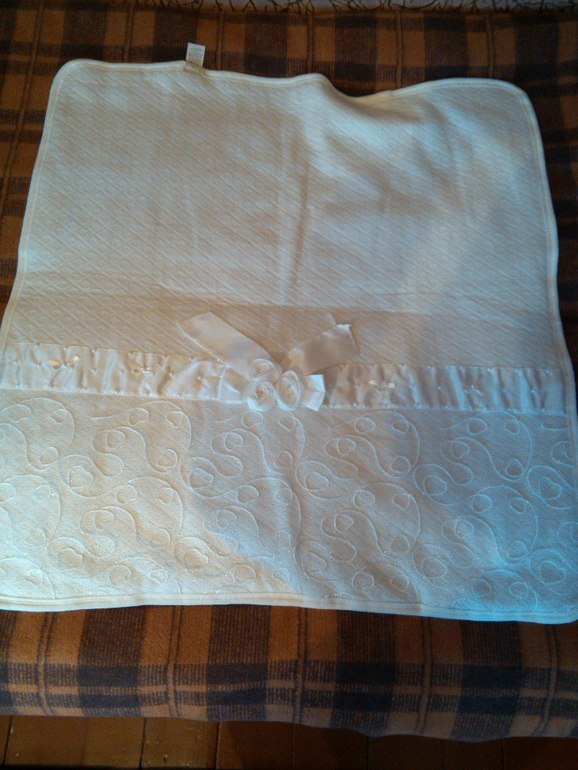 Как сложить даже не знаю,если уголочком,то бантик и кружавчики боком будут. Может пришить змеечку побокам,между собой тогда боковые стороны застегнутся,по низу пришить кнопочки (в ножках),и вверху на уголочках кнопки,которые пристегнутся как раз возле змейки. У меня такой конверт,он как одеяло и как конверт