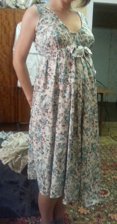 я бы укоротила длину до середины колена. иначе ни то не се. Мне кажется, если длину убрать, будет чуть симпатичнее и не будет ночнушку напоминать (уж извините) и вместо бантика под грудью я бы ремень надела тонкий коричневый .