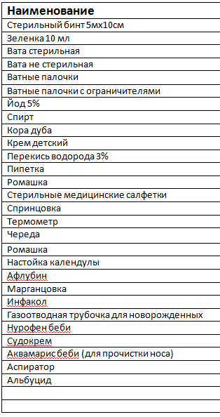 А теперь аптечка, Составляла ее по тому списку, который предлагается в инете при продаже готовых детских аптечек. ну и добавила то, что мне советовали сестры, подруги и бебиблог))) Ромашка у меня 2 раза - ошибочка, у себя исправила.
