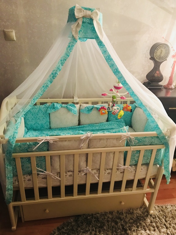 Я купила 2 белые натяжные простыни в икее — идут комплектом. И комплект белья из 3 предметов, тоже в икее -наволочка, простыня, пододеяльник. Но из него пока в ближайшее время пригодится только простыня, так что может и не буду открывать. Бортики отдельно купила, они расстегиваются и можно вынуть поролон и постирать, и можно еще комплект сшить на сменку под этот же поролон. А от балдахина отговорили..как-то так )) Про полиэстр — это может поролон имеется ввиду или наполнитель в подушке?