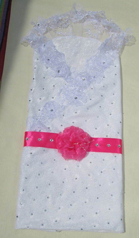 Мне первый больше понравился, со вторым вообще непонятно, ощущение,что он огромный на фоне такого милого конвертика-пледа. Плюс, у конверта очень нежные рюши, а второй банк в сочетании смотрится грубым. =)) в общем я за первый вариант =))