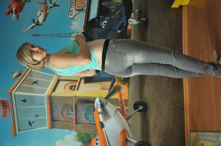 Ну, вот, мы сделали полработы, осталось всего ничего! Прикладываем пояс к джинсам. Я прикалывала булавками сопоставляя боковые швы пояса и джинсов, а потом центр передней и задней части пояса к переду и заду джинсов соответственно. Закрепляем пояс в 4 местах. Этого достаточно, приметывать нужды нет. Теперь пришиваем пояс к джинсам обычной строчкой, натягивая пояс до необходимой ширины отрезка на джинсах. Таким образом прошиваем изделие по кругу. Примеряем. если все хорошо сидит, оверложиваем край. Вуаля! Беременные джинсы готовы! У меня получилось вот что!