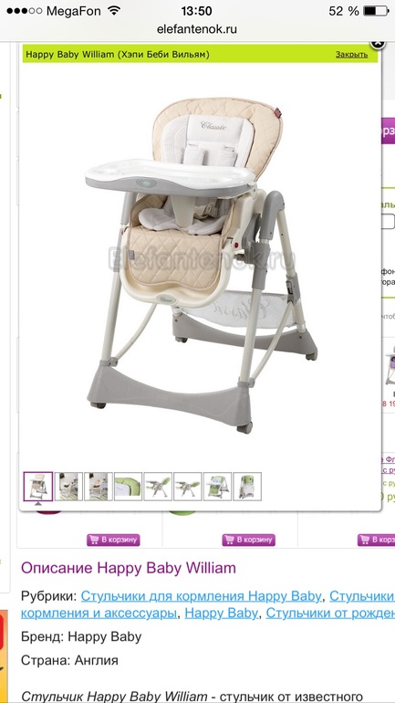 У нас Хэппи Бэби Вильям, я довольна. Прекрасный стульчик, пользуемся с рождения, отлично катается по квартире. В 90% случаев "укатываем" в нем на ночь, днем тоже в нем спит ребенок. У нас стульчике хорошо вписался и по габаритам и по цвету на кухню)) Прочла, что пишут про крошки в строчках... Странно... У меня нет такой проблемы, все легко влажной тряпкой смахивается.