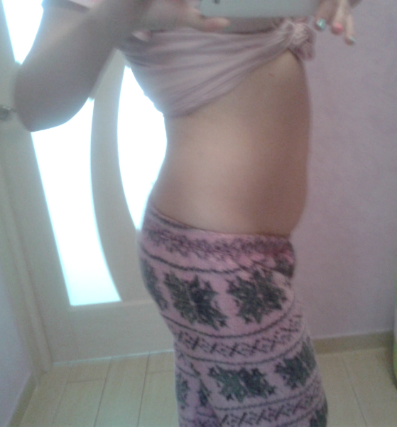 Фотку выставлять не буду, потому что... Нет еще животика. Вообще. Даже намека. плоская кап доска, даже остатки пресса еще видно, хотя уже 15 неделя заканчивается. У некоторых уже все видно))