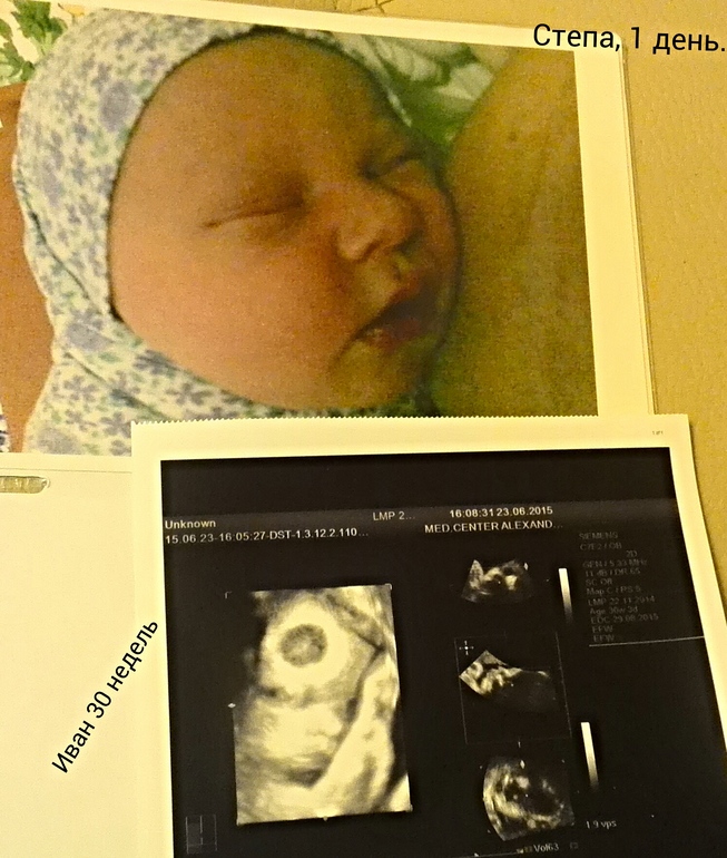 На узи. Нам показали щекастого батона- вес на тот момент определили 1950гр, большая голова с БПР 85 мм, длинные руки и ноги, на голове уже есть волосы cказали родится волосатый. Вобщем на тот момент написали в заключении -плод развит на 33-34 недели, крупный плод.из плохого- степень плаценты третья (((( ну и фото старшего при рождении, и мелкого в животе -одно лицо.