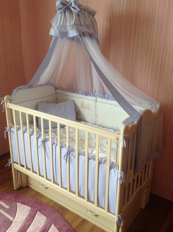 А там внизу всех фото , кроватка дюймовочка,с продольным маятником, комплект Перина Тиффани неженка голубая.матрас я думаю сами  определитесь,он 2000 так что от той суммы отнемите.