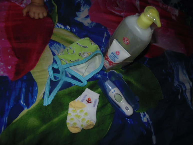 Преобрела электронно-инфракрасный термометр, пока что температуру измеряет правильно, купила уже любимую шампунь-пенку Джонсон, а к нему в подарок ещё и крем под подгузник идёт. Носочки и чепчик просто мизерные, фото конечно не передаёт реально крошечные размеры этих крохотных вещичек