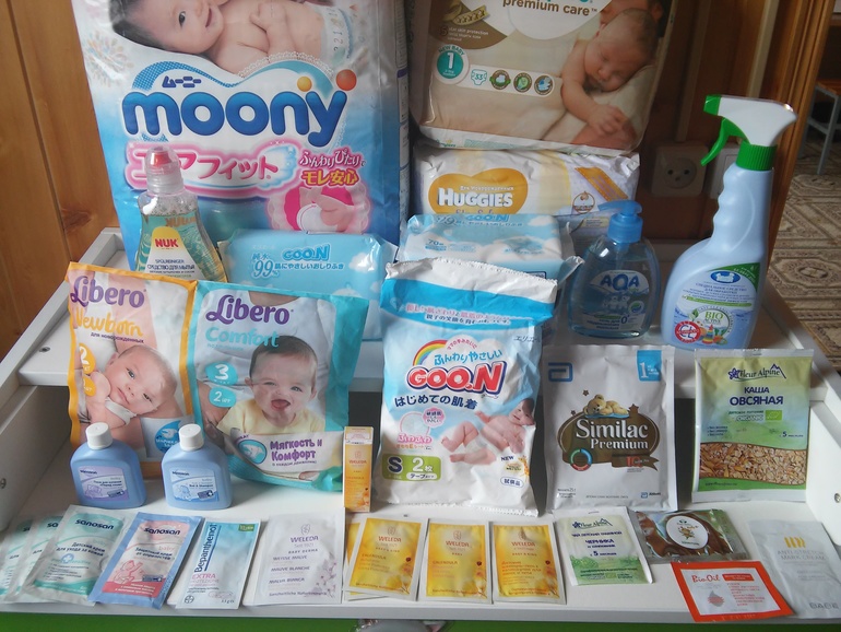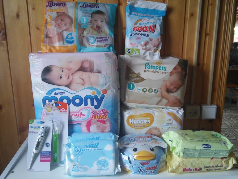 Я купила маленькую пачку Хагис Элит Софт, большую пачку Муни и еще мне подарили пачку Памперс Премиум Кеа, пару пробников Гунов и Либеро. Итого около 150 подгузников. Подумываю об еще одной пачке Муни, но не знаю брать Нью борн или S?