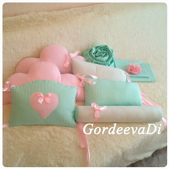 я тащусь с цвета! Обожаю мятный цвет в сочетании с розовым:) И оформление просто сказка!!!!) На заказ или сами шили?