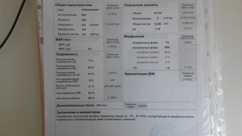 Мы морфологию лечили полгода различными БАДами. Ничего не помогло. По всем анализам: гормоны, УЗИ у мужа было все хорошо. Прикрепляю последнюю спермограмму, месяц до зачатия (естественное зачатие). 1 проц. нормальных спермотозойдов.
