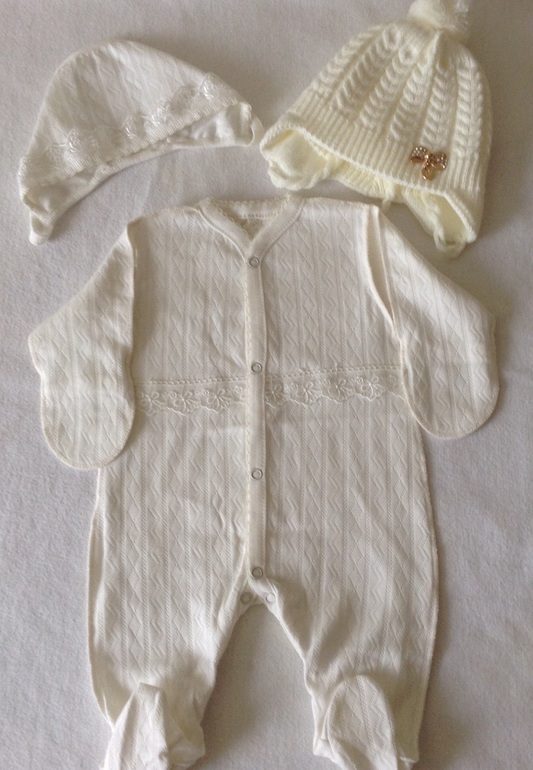 И самое главное, начала готовить комплект на выписку. Купила первый слой и нежнейшую теплую шапочку. Проблема во втором, не могу выбрать, что лучше выбрать, тк сверху либо комбез, либо мешок от Керри.