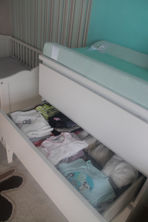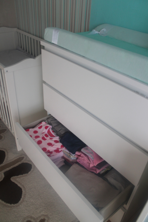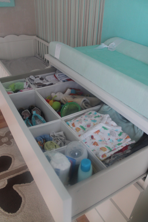 ящики для игрушек тоже пока не купили )))вот немного содержимого в комоде ))) и пеленальная доска была розовая ноя я её перетянула под цвет детской))