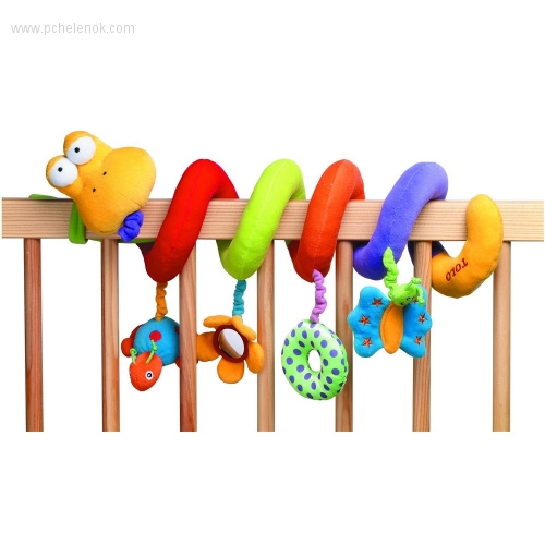 Купите с воздушным колокольчиком. к примеру, Зайца от ТиниЛав (много фирм делает, может и другой приглянется. У нас с рождения, до сих пор (1,5 года)любимая игрушка. В машину переселился, но до сих пор пользуется успехом в ребенка.